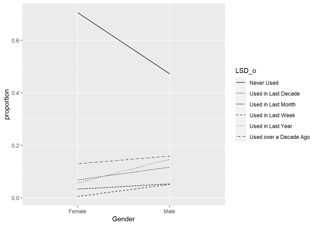 8.1 a. (5 points) Make a plot or set of tables showing the distribution of LSD use between genders and interpret. You can use code similar to that on slide 84 of the course notes.
