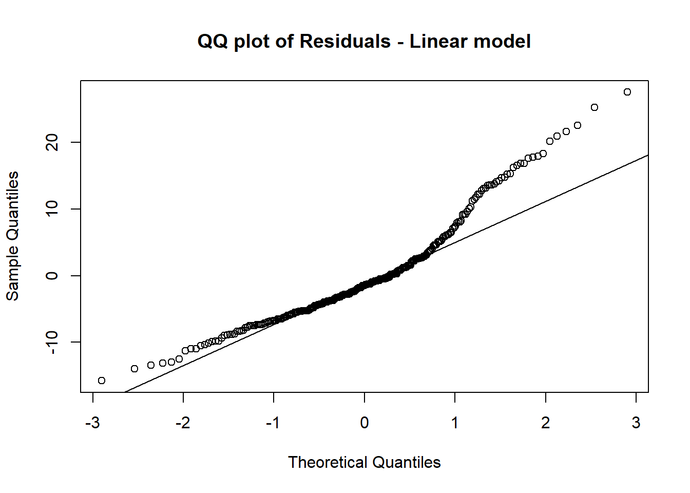 qqnorm(residuals(lm_model),main="QQ plot of Residuals - Linear model")