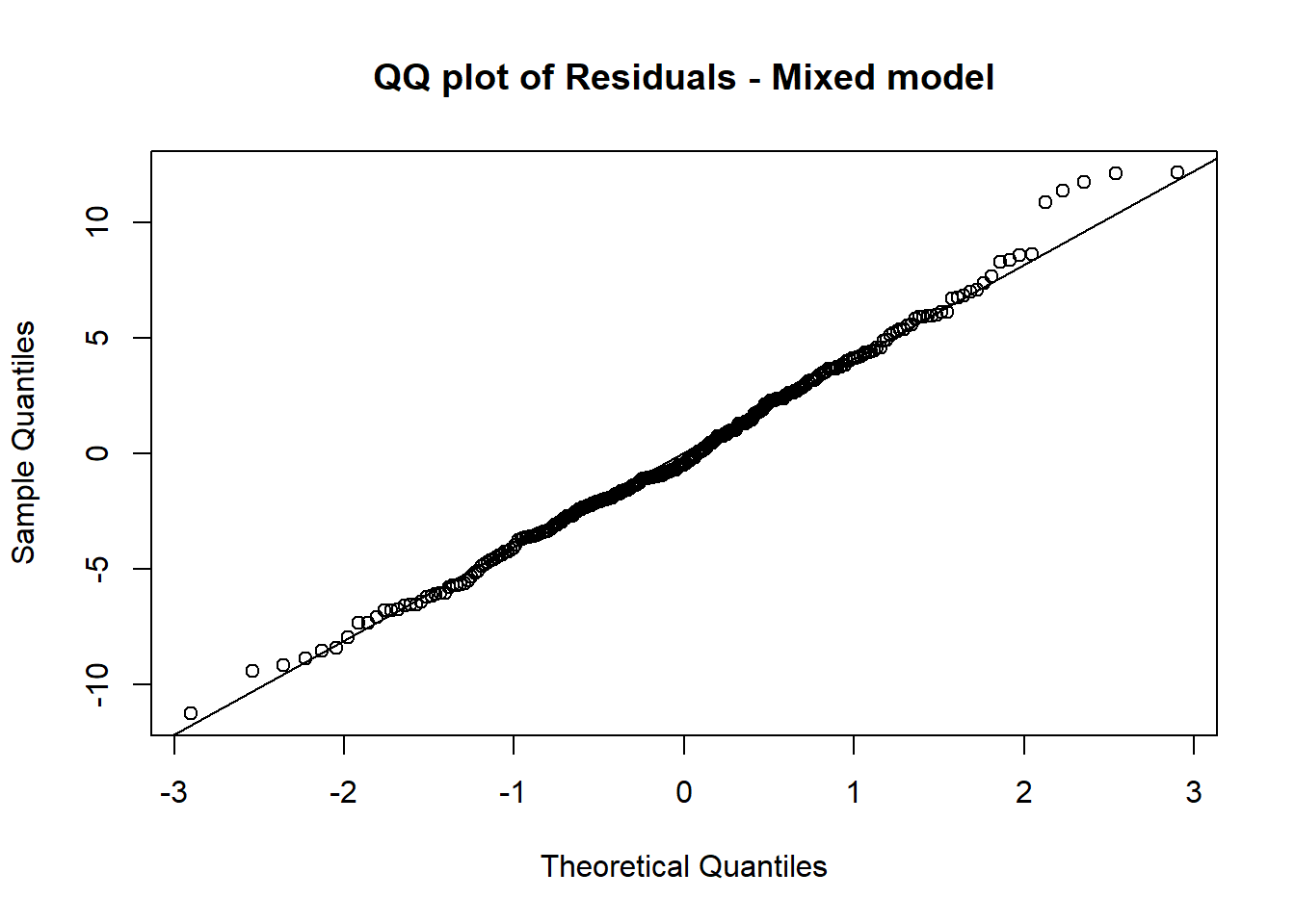 qqnorm(residuals(mixed_model),main="QQ plot of Residuals - Mixed model")